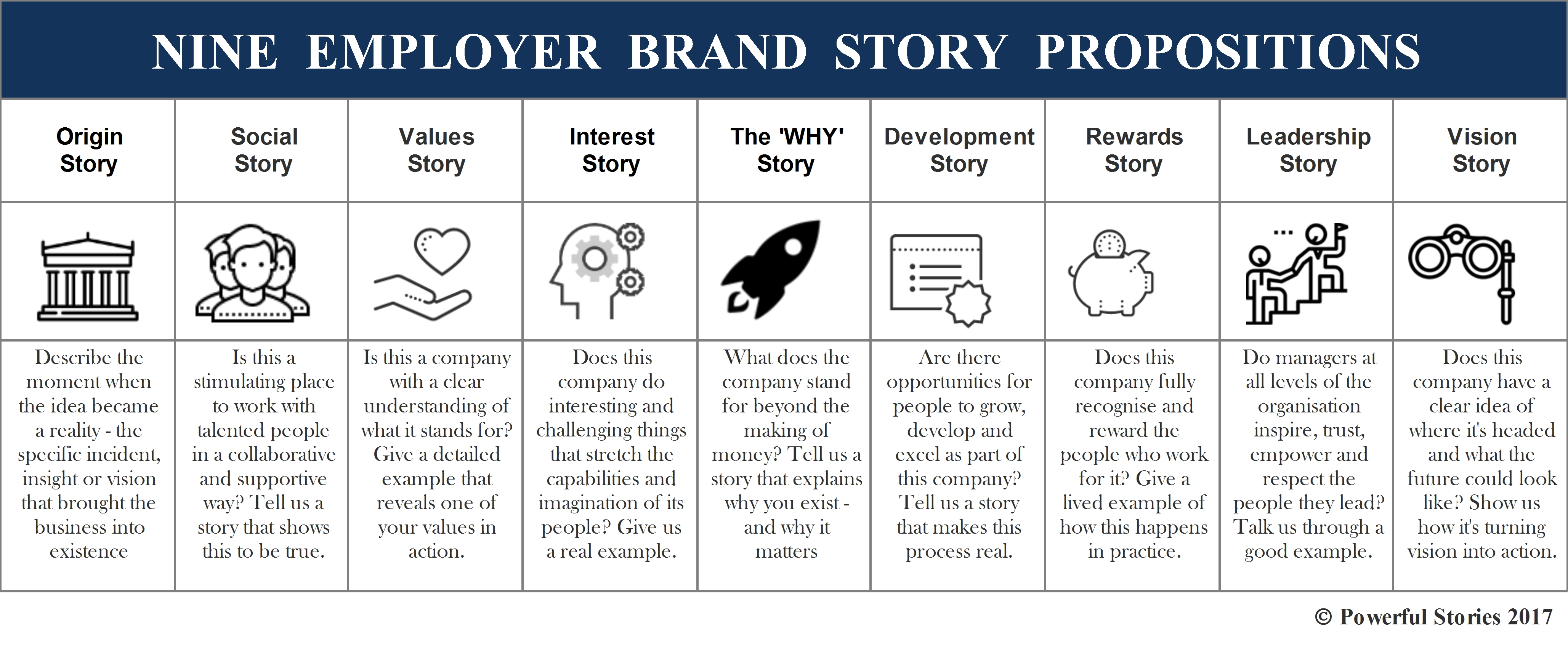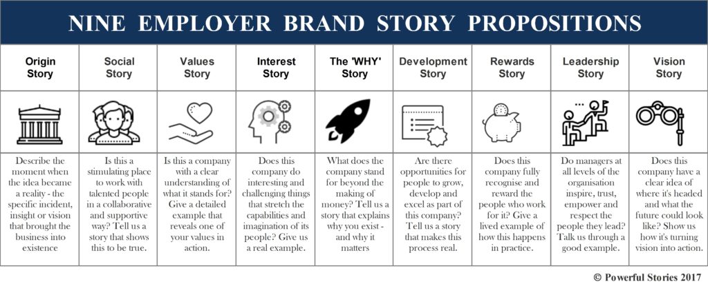 The “Nine Employer Brand Propositions” tool, for instance, will help you identify the core stories required for a coherent and comprehensive brand storytelling strategy. This wisdom is the result of more than two decades spent in the employer branding and recruitment marketing trenches where we've developed a profound understanding of what works - and what doesn't.
